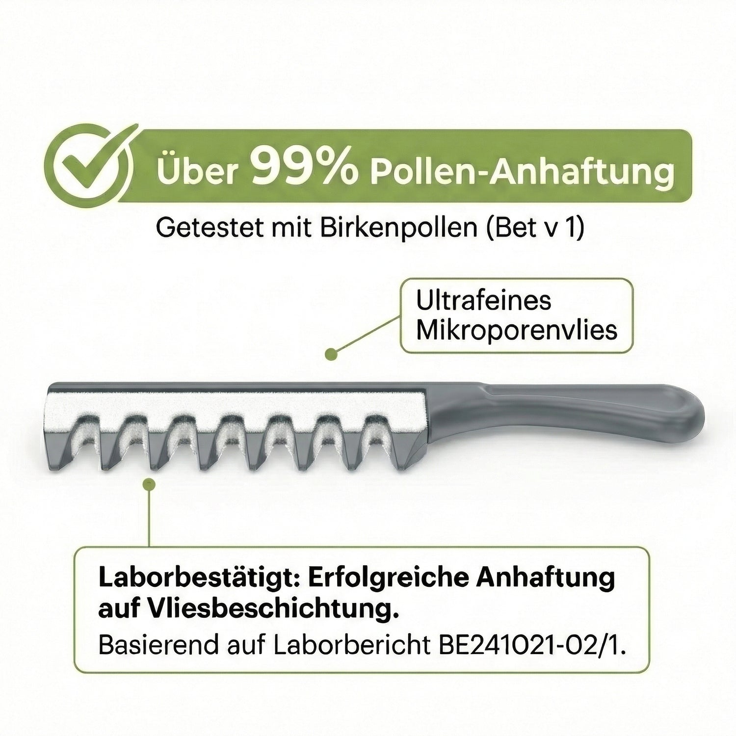 Patentiert und laborgeprüft: Über 99% der Pollen bleiben am Material haften