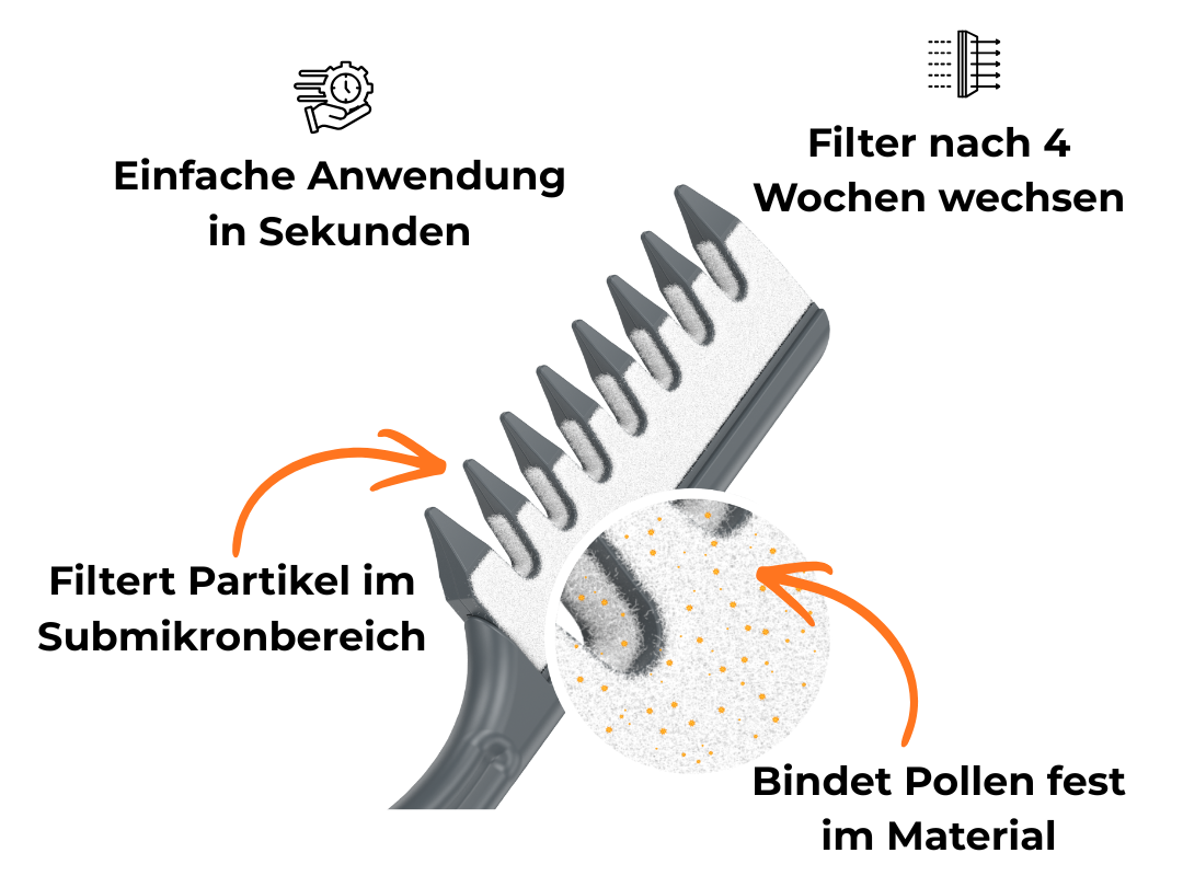 Der wechselbare Pollenfilter entfernt dank seiner elektrostatischer Eigenschaften und ultrafeiner Mikroporenstruktur Pollenpartikel sicher aus dem Haar und hält sie dauerhaft im Filtermaterial fest. Dies wurde umfangreich in zahlreichen Untersuchungen durch ein spezialisiertes Mess- und Analyselabor geprüft. Getestet wurde sowohl die Auskämmbarkeit von Birkenpollen aus Echthaar als auch die reine Pollenanhaftung am Filtermaterial. Hier geht’s zum Laborbericht.